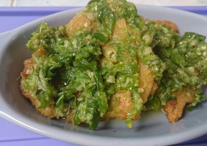 Ayam yang termarinasi bumbu, bersalut tepung dan digoreng dengan sempurna, kemudian ayam goreng digeprek dan dilumuri sambal ijo yang 1 sambal cabai hijau: